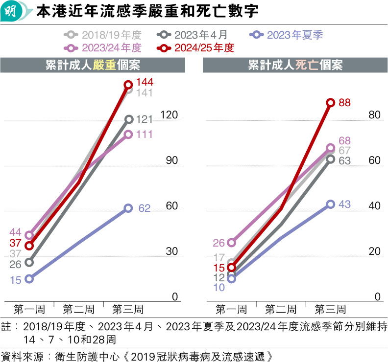 【明報專訊】本港正處於流感季節,衛生防護中心最新的數據顯示,本地流感活躍度持續上升,上周(1月19至25日)共錄得65宗成人嚴重個案,其中46人死亡,兩者均較前一周增加。數據亦顯示,今個流感季節首3周(1月5至25日)共錄得144宗成人嚴重及88宗成人死亡個案,均超越過去4次流感季節同期水平(見圖)。