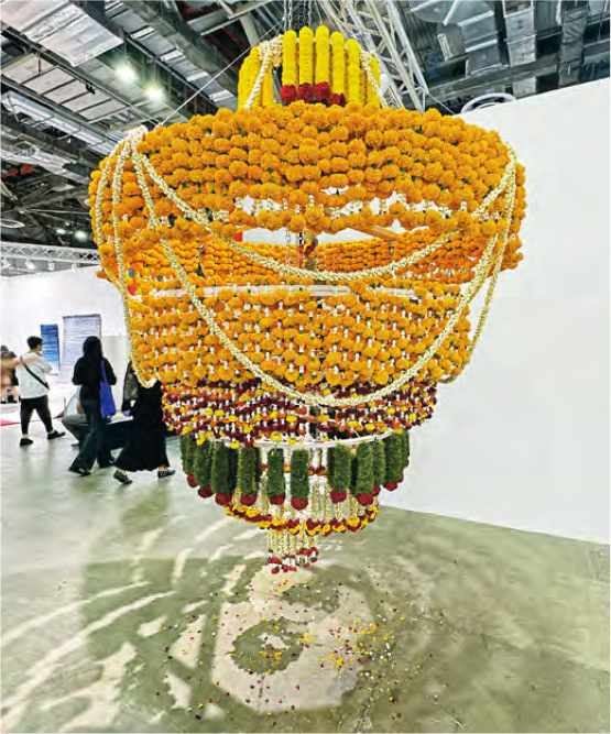 這次展會共有105家來自世界各地的畫廊參展,其中不乏名家名作。值得一提的是,一些青年藝術家也為公眾帶來了有趣的作品。來自泰國的藝術家Naraphat Sakarthornsap在展會現場佈置了一個鮮花做成的吊燈,並輔以吊燈墜落過程的影像和圖片。現場遇見他時,我們才得知吊燈下墜的深意。自上而下分佈的鮮花,價錢由貴而賤,象徵着社會的等級秩序。當它墜落時,最先受損的是最底層,而最上層卻不會有任何損傷。這件裝置作品名為A Hopeless Hope,無望之望也是希望,人們只有更深入了解我們的社會結構,人類才有改變的希望。
