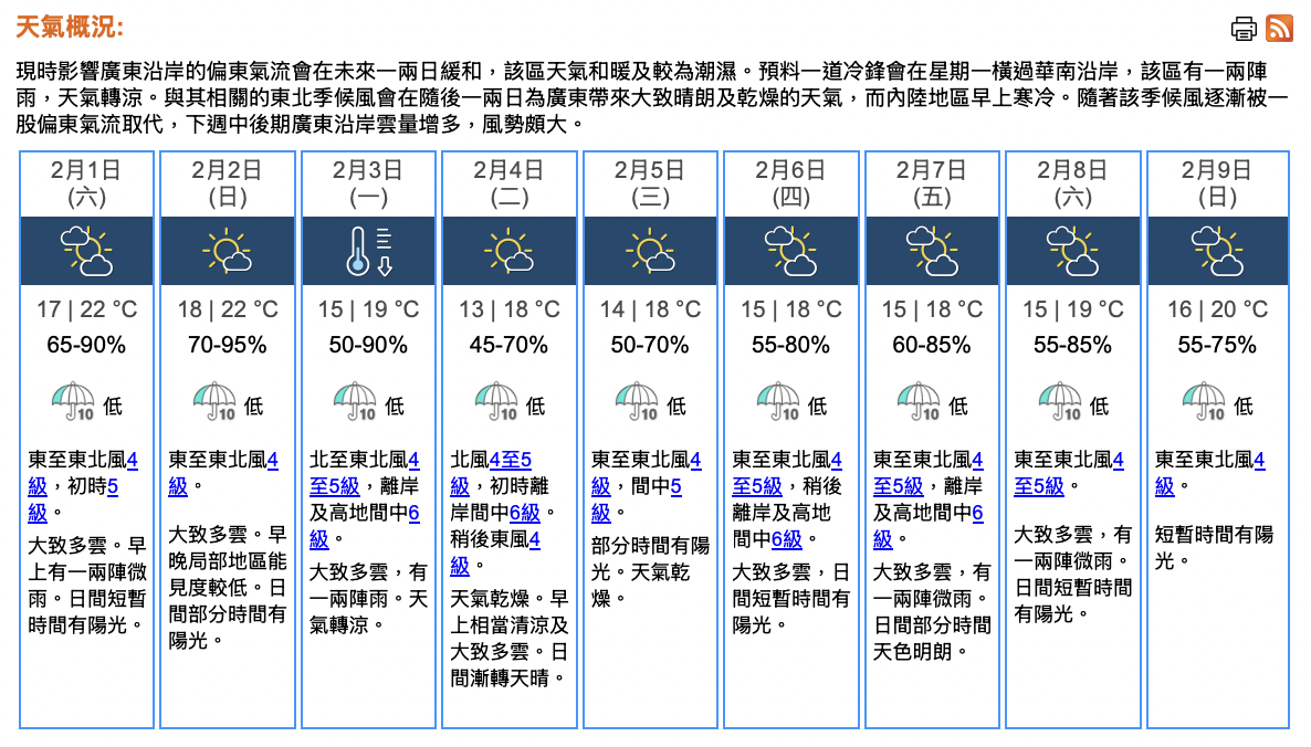 即時熱點 天氣|天文台:周六多雲有雨最高22℃ 下周氣溫再降最低13℃ (19:01) 發佈於 11 個月 前 2025 年 1 月 31 日 By 明報 天文台表示,現時影響廣東沿岸的偏東氣流會在未來一兩日緩和,該區天氣和暖及較為潮濕,預測本港今晚(1月31日)及明日(2月1日)大致多雲,有一兩陣微雨,最低氣溫約17℃。日間短暫時間有陽光,最高氣溫約22℃。吹和緩東至東北風,初時風勢清勁。 展望下周日(2月2日)天氣和暖及較為潮濕。下周一(2月3日)北風增強,氣溫下降。下周二(2月4日)早上市區最低氣溫在13℃左右,新界再低兩三度。隨後一兩日早上仍然清涼。(天文台) 相關文章:天文台天氣天氣速遞編輯推介 Up Next 賞花情報|紫花風鈴木屯門公園盛放 洋紫荊九龍仔公園、荔枝角公園可賞 (19:37) 不要錯過 天氣|天文台:多雲有微雨 最高氣溫21°C (10:11) 繼續閱讀 贊助商 猜你喜歡 天氣|天文台:日間部分時間有陽光 最高22°C (08:32) 天氣|今日天晴乾燥 市區最高氣溫料25°C 聖誕節料早晚清涼 (09:12) 天氣|平安夜料溫暖 聖誕節市區氣溫最低15°C Boxing Day 14°C (20:15) 天氣|天文台:日間乾燥及溫暖 最高25°C (09:46) 天氣|天文台:日間部分時間有陽光 最高23°C (08:46) 天氣|天文台:日間乾燥 晚上漸轉多雲 (08:20)