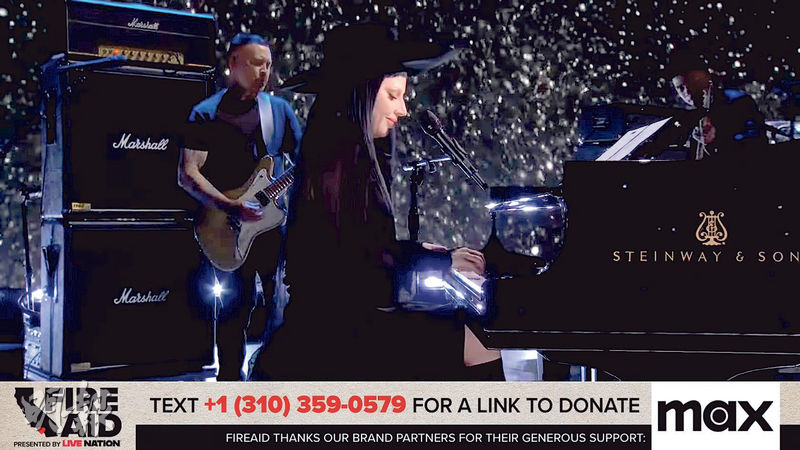 【明報專訊】為加州山火災民籌款而舉辦的FireAid慈善音樂會,前晚在洛杉磯兩大場館Intuit Dome及Kia Forum同時舉行,一眾樂壇巨星包括Rod Stewart、Katy Perry、Billie Eilish、殿堂級樂隊Nirvana、Green Day及Red Hot Chili Peppers等傾力演出,以歌聲為災民打氣。百變天后Lady Gaga壓軸登場,唱出她跟未婚夫米高波蘭斯基(Michael Polansky)攜手創作新歌,「只限今晚表演、只為你們而唱……我們相信時間可以戰勝一切,時間是治癒創傷的良藥」。