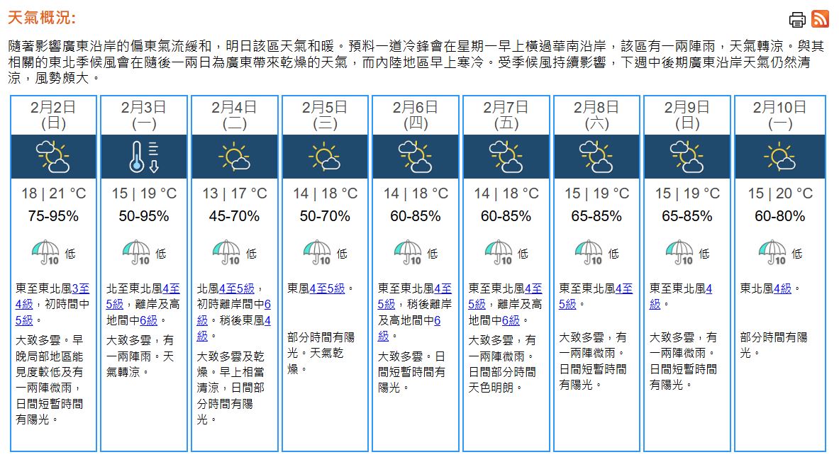 即時熱點 天氣|天文台:明日18至21°C 能見度較低有微雨 (18:36) 發佈於 11 個月 前 2025 年 2 月 1 日 By 明報 天文台表示,隨着影響廣東沿岸的偏東氣流緩和,明日(2月2日)該區天氣和暖。預料一道冷鋒會在下周一(2月3日)早上橫過華南沿岸,該區有一兩陣雨,天氣轉涼。 本港地區今晚(2月1日)及明日大致多雲。明日早晚局部地區能見度較低及有一兩陣微雨,日間短暫時間有陽光。氣溫介乎18至21°C。吹和緩東至東北風,明日初時風勢間中清勁。 展望下周一北風增強,氣溫下降。下周二(2月4日)早上市區最低氣溫在13°C左右,新界再低兩三度。隨後一兩日早上仍然清涼。(天文台) 相關文章:天文台天氣天氣速遞編輯推介 Up Next 年桔、賀年盆栽僅作觀賞 食安中心提醒不適合食用 (18:30) 不要錯過 天氣|天文台:17°C-22°C 多雲短暫有陽光 (10:11) 繼續閱讀 贊助商 猜你喜歡 天氣|天文台:日間乾燥溫暖 最高25°C (08:14) 天氣|天文台:周三大致天晴乾燥 市區最低19°C (21:08) 天氣|天文台:大致天晴 最高23°C (08:14) 天氣|天文台:周二天晴乾燥 早上市區最低18°C (20:52) 天氣|天文台:有陽光及乾燥 日間最高20°C (08:17) 寒潮 | 廣州最低氣溫跌至1.7℃ (16:58)