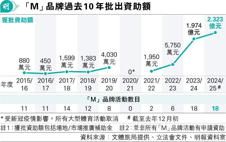 政府為吸引更多大型體育盛事落戶香港,在2023年增加「M」品牌活動資助上限、取消申請者每年舉辦活動的限額、容許私人機構申請等。根據文體旅局數字,新措施下「M」品牌資助額急升,本年度截至去年12月初,已批出2.323億元資助,按年增加近兩成,並相當於「M」品牌自2004年成立至2021年批出的撥款總額。截至同期的「M」品牌活動數目則有18個,與前一年度相同,計及之後舉辦的賽事,將創歷來新高。
