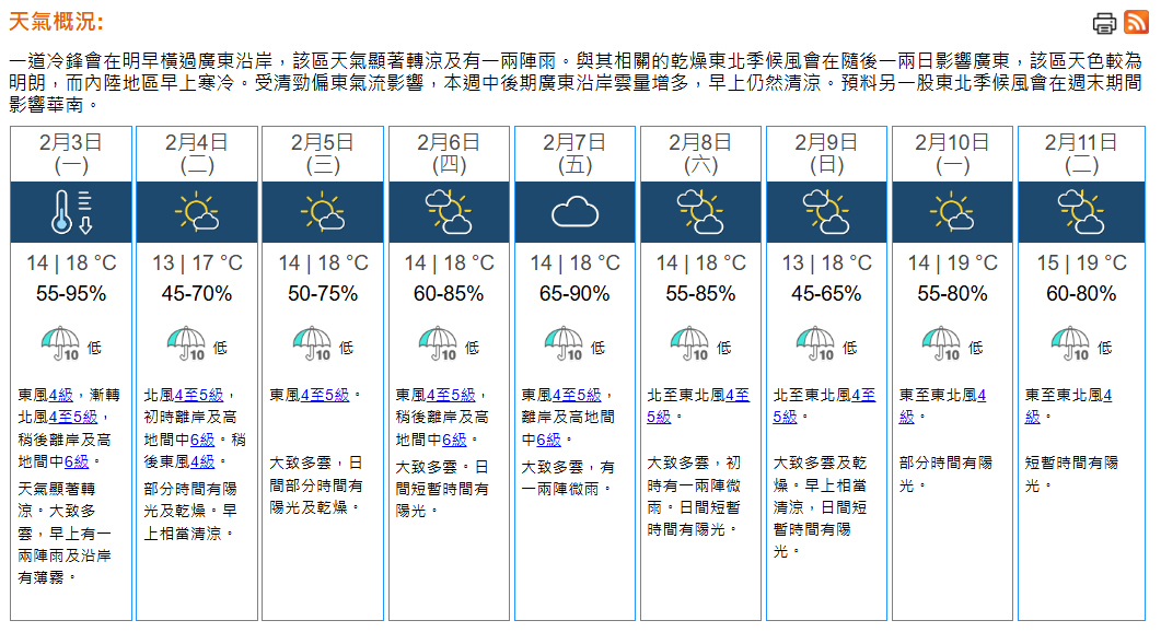 即時熱點 立春天氣|天文台:周一早上一兩陣雨 市區氣溫逐步降至14°C 周二新界寒冷 (21:00) 發佈於 9 個月 前 2025 年 2 月 2 日 By 明報 本港地區今晚(2日)及明日立春(3日)天氣預測:大致多雲,今晚及明早有一兩陣雨及沿岸有薄霧。明日天氣顯著轉涼,氣溫由初時約18°C,逐步下降至市區最低約14°C,新界再低一兩度。吹和緩東風,明日北風逐漸增強。展望周二早上市區最低氣溫在13°C左右,新界再低兩三度及寒冷,日間天色漸轉明朗。隨後兩三日早上仍然清涼。(天文台) 相關文章:天文台天氣天氣速遞立春編輯推介 Up Next 天文台發寒冷天氣警告 明早寒冷市區最低12°C (16:29) 不要錯過 短片:泰山景區試推登山助力機械人 遊客:一口氣登頂不費力 (17:41) 繼續閱讀 贊助商 猜你喜歡 天氣|天文台:周一早上市區氣溫料22°C 周四降至20°C (19:02) 天氣|天文台:今日乾燥部分時間有陽光 市區最高氣溫27°C (09:09) 天氣|天文台:日間最高28°C 吹和緩北至東北風 (09:31) 天氣|天文台:周日多雲日間乾燥 氣溫24至30°C (20:01) 短片:樺加沙一個月後 重災區將軍澳海濱未復常、富麗敦海洋公園酒店大門復修中 (08:59) 天文台:今日沿岸水位高0.5至1米 晚上漲潮部分沿岸低窪地區或輕微水浸 (08:35)