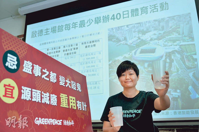 【明報專訊】啟德體育園近期頻頻做測試活動,做好準備迎接下月正式開幕,當中包括食肆及商舖的零售館已試業一個多月。綠色和平預計,啟德體育園啟用後,可容納5萬人的主場館在100%入座率情況下,若每年舉辦40場體育活動,場內的小食店每年派發逾121.6萬件即棄餐具及容器;綠色和平促園方做好回收工作,以及提供可循環再用的杯及容器,又建議政府撥款一千萬元在園內建立重用杯借還系統。