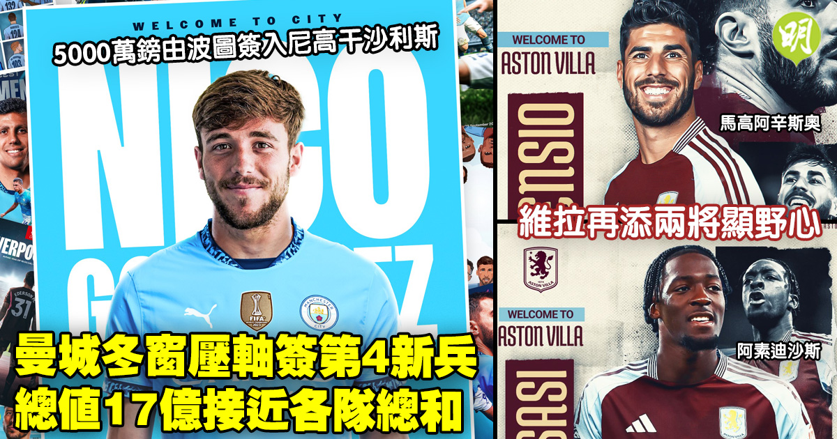 英超|曼城冬窗壓軸簽第4新兵 總值17億接近各隊總和 維拉添阿辛斯奧迪沙斯顯野心 (18:30)