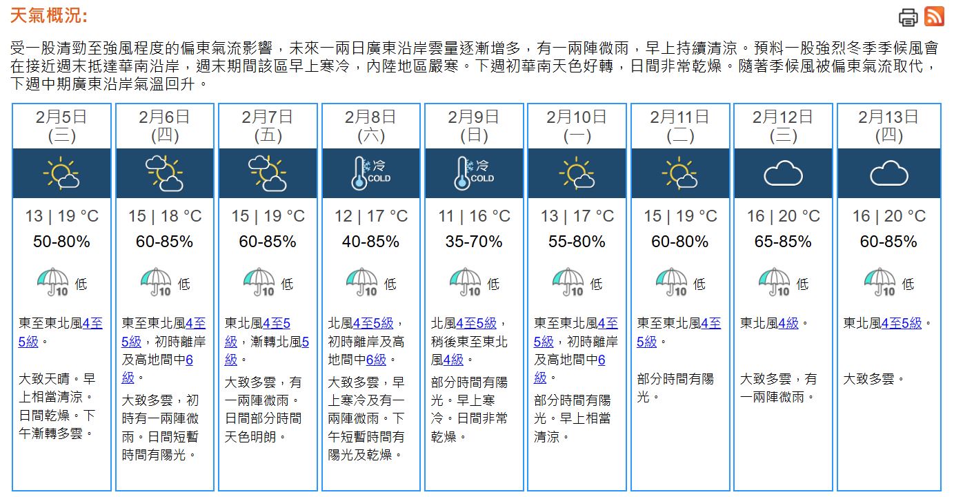 即時熱點 天氣|天文台:早上清涼 日間最高19°C (08:06) 發佈於 11 個月 前 2025 年 2 月 5 日 By 明報 上午7時50分,天文台錄得氣溫13.7°C,相對濕度74%。一股偏東氣流正影響廣東沿岸。同時,廣東天色大致良好。本港今早(5日)相當清涼,市區氣溫下降至13°C左右,新界再低幾度。 本港地區今日天氣預測大致天晴,早上相當清涼,日間乾燥,最高氣溫約19°C。下午漸轉多雲。吹和緩至清勁東至東北風。 展望未來一兩日大致多雲,早上持續清涼。周五(7日)漸轉吹偏北風,周末期間早上寒冷,市區最低氣溫在11°C左右,新界再低幾度。下周初天色好轉,日間非常乾燥。(天文台) 相關文章:天文台天氣天氣速遞編輯推介 Up Next 網傳小童壽司郎舔薑片夾 香港壽司郎:考慮更改薑片提供方式 (17:13) 不要錯過 桃花回收|全港桃花收集站開放 2月14日起僅屯門Y.PARK回收桃花 (09:18) 繼續閱讀 贊助商 猜你喜歡 天氣|天文台:日間部分時間有陽光 最高22°C (08:32) 天氣|今日天晴乾燥 市區最高氣溫料25°C 聖誕節料早晚清涼 (09:12) 天氣|平安夜料溫暖 聖誕節市區氣溫最低15°C Boxing Day 14°C (20:15) 天氣|天文台:日間乾燥及溫暖 最高25°C (09:46) 天氣|天文台:日間部分時間有陽光 最高23°C (08:46) 天氣|天文台:日間乾燥 晚上漸轉多雲 (08:20)
