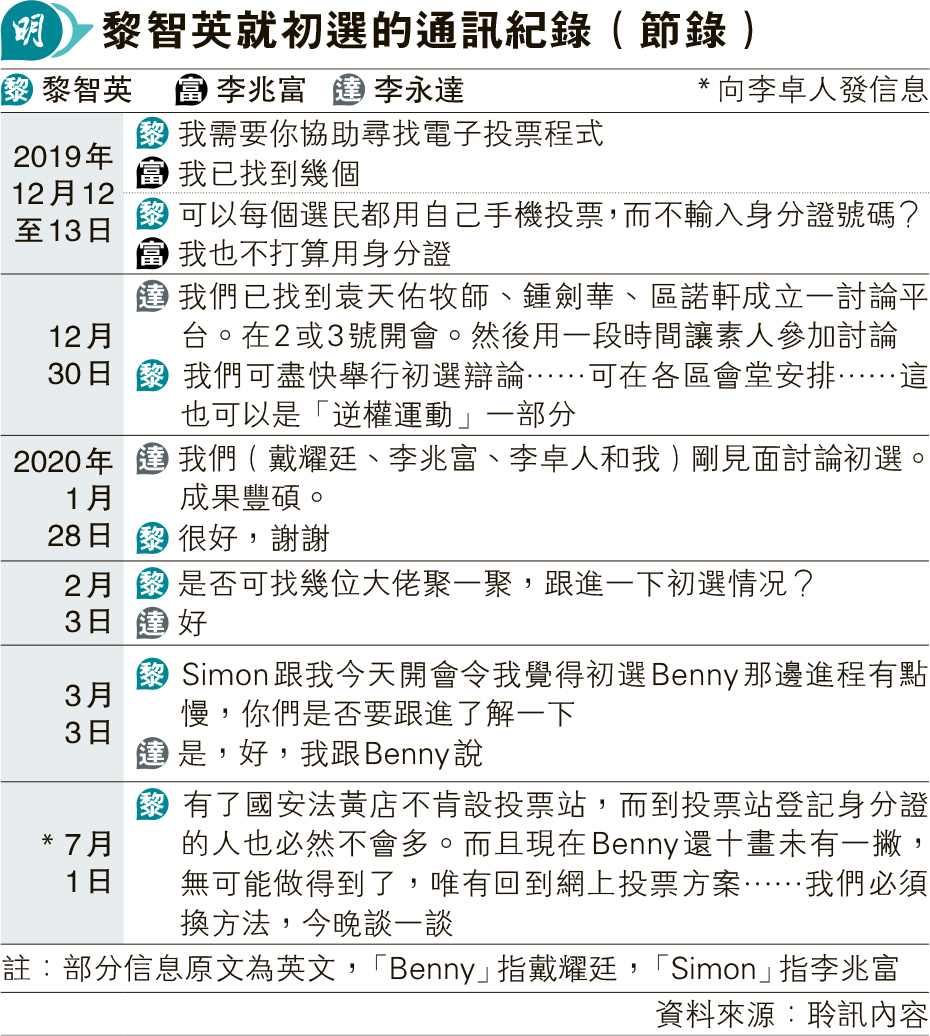 控方昨指,就着黎智英與陳梓華2019年12月31日第四次會面,黎在主問下曾稱忘記討論內容,亦無為意初選。控方展示黎就初選與不同人的信息來往(見表),其中2019年12月13日黎邀請李兆富幫忙尋找電子投票程式,希望翌晚飯局前掌握投票軟件的資訊,李回覆稱已暫定某程式。黎12月14日回覆「他們」覺得很有用,並詢問價格,翌日另向民主黨前主席李永達發訊稱李兆富是初選軟件的「始作俑者」,若有問題可請李兆富到場示範。