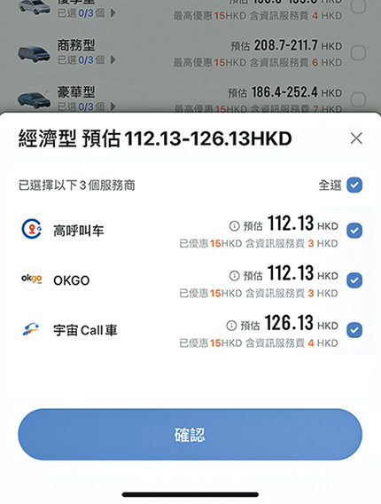 記者在3間平台試網約最便宜的「經濟型」私家車。以早上繁忙時間約8時許從鑽石山到銅鑼灣為例,高德3間供應商「高呼叫車」、「宇宙call車」及「OKGO」收費介乎112至126元,計及東隧收費40元後收約152至166元。同一路線下TADA及Uber分別收約167及197元,即高德較兩平台最多便宜約三成。