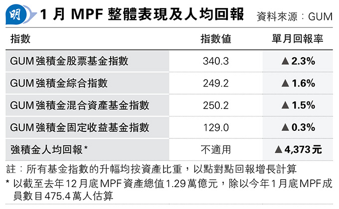 【明報專訊】強積金(MPF)諮詢機構GUM公布1月份MPF表現,據GUM為各類資產所制定的MPF指數顯示,月內「GUM強積金股票基金指數」回報率為2.3%,為資產類別指數中回報率最高(見表),而綜合指數、混合資產指數及固定收益基金指數的回報率,分別為1.6%、1.5%及0.3%。GUM亦按去年12月底MPF資產總值1.29萬億元,以及今年1月底MPF成員475萬人估算,1月MPF成員人均回報為4373元。