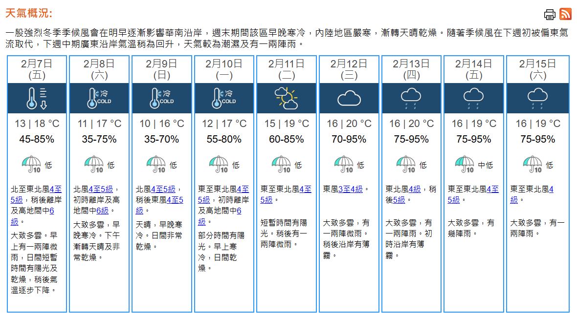 即時熱點 天文台:周五稍後逐步降溫 周日降至9至10°C 或是入冬最低紀錄 (16:42) 發佈於 11 個月 前 2025 年 2 月 6 日 By 明報 天文台表示,一股強烈冬季季候風會在明早(7日)逐漸影響華南沿岸,本港明日稍後氣溫將逐步下降,天文台屆時會發出寒冷天氣警告。預料周六(8日)早上市區氣溫會在11°C左右,周日(9日)進一步下降至9至10°C水平,有機會是入冬以來的最低紀錄。 周末期間新界多處地區早上嚴寒,高地氣溫或接近冰點,漸轉天晴及非常乾燥。此外,由於風寒效應較顯著,身體感覺的溫度會較實際氣溫低。(天文台) 相關文章:天文台天氣天氣速遞編輯推介 Up Next 山東美術教師畫10米高哪吒壁畫【附短片】 (12:02) 不要錯過 短片:日本大雪 民眾忙於剷雪 (12:30) 繼續閱讀 贊助商 猜你喜歡 天氣|天文台:日間乾燥溫暖 最高25°C (08:14) 天氣|天文台:周三大致天晴乾燥 市區最低19°C (21:08) 天氣|天文台:大致天晴 最高23°C (08:14) 天氣|天文台:周二天晴乾燥 早上市區最低18°C (20:52) 天氣|天文台:有陽光及乾燥 日間最高20°C (08:17) 寒潮 | 廣州最低氣溫跌至1.7℃ (16:58)