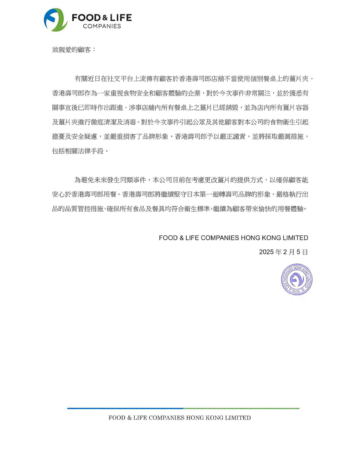 即時熱點 網傳小童壽司郎舔薑片夾 香港壽司郎:考慮更改薑片提供方式 (17:13) 發佈於 9 個月 前 2025 年 2 月 5 日 By 明報 網上流傳有小童在香港壽司郎其中一家分店舔薑片夾,香港壽司郎今午(5日)發聲明表示,就近日社交平台上流傳有食客於香港壽司郎店舖不當使用個別餐桌上的薑片夾,引起公眾及其他顧客對該公司的食物衛生引起擔憂及安全疑慮,香港壽司郎予以嚴正譴責,並將採取嚴厲措施,包括相關法律手段。壽司郎稱,獲悉事件後已即時跟進,銷毁涉事店舖所有餐桌上的薑片,並徹底清潔及消毒薑片夾。為避免同類事件發生,壽司郎表示,目前在考慮更改薑片提供的方式,以確保食客能安心用餐。(香港壽司郎) 相關文章:壽司郎熱門HOTPICK編輯推介香港壽司郎 Up Next 特朗普簽令禁跨性別者參加女子體育賽事 (16:30) 不要錯過 春節假將結束內地交通流量現高峰 公路單日預計3.1億人次【多圖】 (13:24) 繼續閱讀 贊助商 猜你喜歡 短片:維港四大充氣雕塑率先睇 海上巡遊市集設打卡位【附門票價錢詳情】 (16:58) 泰國王太后詩麗吉辭世 圖輯回顧詩麗吉美貌與時尚 (14:57) 【短片】葉劉淑儀:我不是退休 續其他平台工作 「我的應援會、網民不要失望」 (13:28) 2025美食嘉年華葵涌開鑼 $1廣昌隆百元現金券、金華火腿 每日送50杯紅白酒【附門票及優惠詳情】 (10:44) 馬灣1868秋日藝術之旅 自製水燈寄託祝福 《世外》展覽免費睇|秋日好去處 (09:30) 台灣「禁豬令」影響原住民祭典無豬拜 改拜「米糕豬」 網民:似北極熊 (18:57)