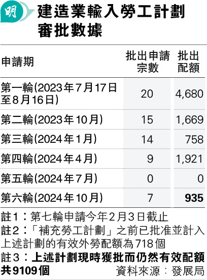發展局又說,目前獲批而仍然有效的外勞配額共9109個,較過往累計批出的9731個少,主因獲批個案相關工序完結,部分則因承建商和分包商聘用本地勞工後退還未動用配額。局方認為計劃充分考慮每宗申請理據與情况,亦能照顧建造業人力需求。第七輪申請本月3日截止,局方正按程序處理。