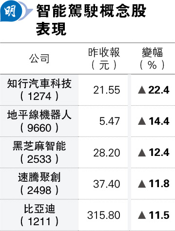 消息傳出後,車股及智能駕駛概念股集體上揚,比亞迪昨股價最高見316.4元,創1個月高,收報315.8元,升11.5%,成交56.72億元;提供自動駕駛解決方案及產品的知行汽車(1274)更大幅上漲22.4%,報21.55元,成交2.61億元。