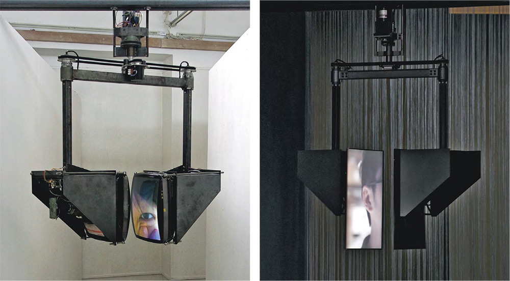 「現在的習慣也是想作品盡量在它必須的form(形態)之內製作,先想它可以怎樣拆掉。」董永康在電腦完成設計後會找工廠幫他製造部件,再自行裝嵌。重製版本主要分為三部分——主架和另外兩面熒幕,熒幕卡上主架,接上電線就完成。而轉動部件使用不鏽鋼外,主要都是鋁,他打開模型軟件仔細介紹:「它(吊緊熒幕的管道)是一條不鏽鋼方通,我不想太厚重的話,只能夠盡量偷薄,但也要維持堅硬,可以承受整個熒幕的力量……」管道又會有中空的位置,營造穿透感,不至過度堅實;兩邊的面板呈梯形,對應原始《i / i》的外形,構建體積和用作擺放電線的空間,平衡重量;屏幕換上LCD顯示器作為鏡的平面,「畫面一直旋轉的時候,就會好像在你腦海裏面,雕塑出當刻照鏡的一個空間」。