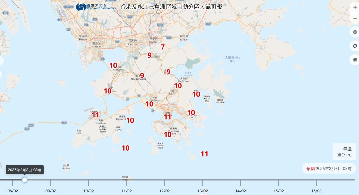 天文台預測,明日日間漸轉天晴及非常乾燥,最高氣溫約16°C。吹和緩至清勁北風,初時離岸及高地間中吹強風。下周一(10日)早上仍然寒冷。下周中期氣溫逐漸回升,雲量增多及較為潮濕。(天文台)