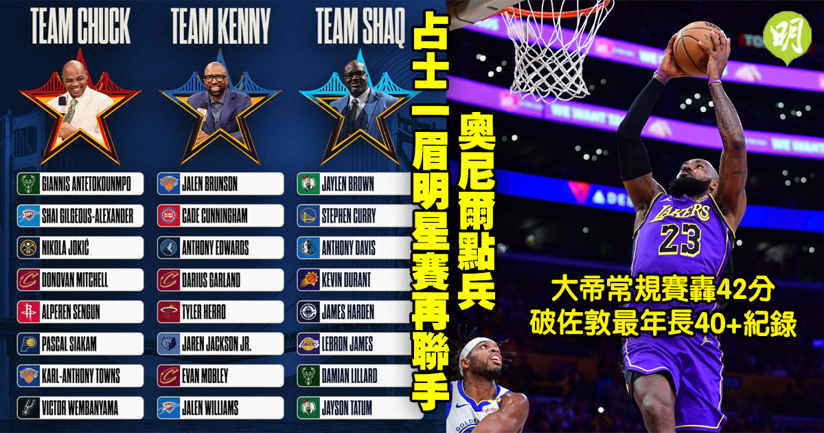 將於本月17日舉行的2025年NBA全明星賽今屆改制,24名入圍球星將分為3隊(每隊8人),3名NBA名將包括奧尼爾、堅尼史密夫及巴克利今(7日)進行點兵,其中奧尼爾揀選了洛杉磯湖人球星「大帝」勒邦占士,以及剛由「紫金軍團」轉戰達拉斯獨行俠的「一眉」安東尼戴維斯入伍,兩人有機會在明星賽再合作。