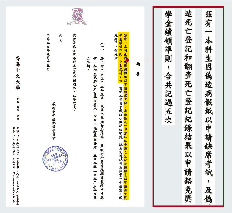 社交平台昨流傳一封中大教務會學生紀律委員會(下稱委員會)去年9月13日的公告,一名本科生為申請缺席考試和續領獎學金,分別偽造病假紙、死亡登記和翻查死亡登記紀錄結果,合共記過5次。委員會裁決小組認為違規性質十分嚴重,裁定涉事學生本學年兩學期暫行休學,並向所屬書院輔導長提交反思信;若學生已符合所有畢業要求,則不予畢業評核,直至本年度第二學期。