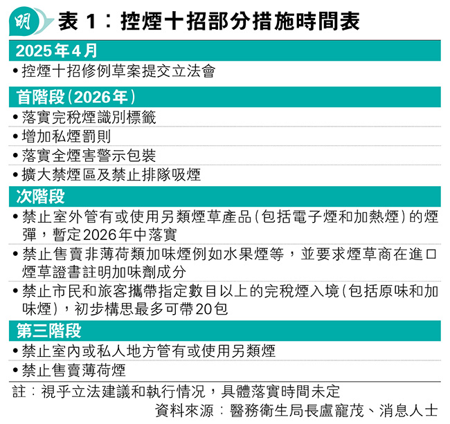 政府去年6月公布10項控煙措施,盧寵茂昨於無綫《講清講楚》稱會循序漸進落實,擬明年先推完稅標籤和增加私煙罰則等,下一步才禁另類和加味煙。據悉政府擬分至少3階段推行(見表1),首階段的禁排隊吸煙因執法困難,研以擴大禁煙區執行,初步擬禁公共交通候車區吸煙,變相一人等車亦不能吸煙。