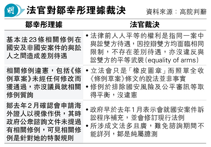 案件由國安法指定法官李運騰、陳仲衡及黎婉姫審理,判辭一一駁回鄒的3項理據(見表)。判辭稱,控辯雙方在相關修例下均不得以電視直播聯繫取得證供,面對相同限制,不存在差別待遇。相關修例只涉及有限度規範傳召證人的模式,沒改變證人應親身到庭作供的大原則,亦不影響控辯傳召證人的權利,無損被告應得的公平審訊,况且辯方本無責任自證清白或傳召證人,靠挑戰控方證據已成抗辯,可見相關修例對辯方影響很有限。