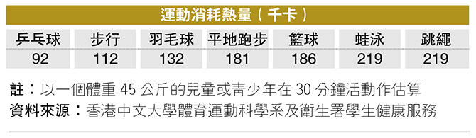 參考圖表為不同活動的熱量消耗估算。當然,運動的選擇都要符合個人興趣和能力,量力而為。(表)