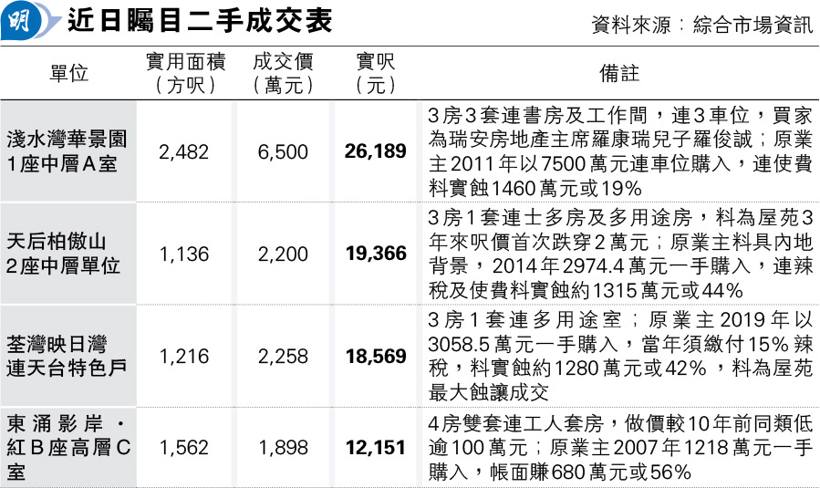 另資料顯示,瑞安房地產(0272)主席羅康瑞兒子羅俊誠,早前以6500萬元透過國海有限公司名義,購入淺水灣華景園第1座中層A室,實用2482方呎3房3套連書房等間隔、實呎26,189元;原業主2011年7500萬元購入,帳面蝕1000萬元或13%,連使費有可能實蝕約1460萬元或19%。