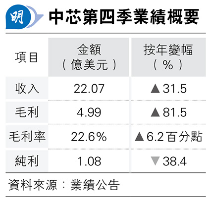 【明報專訊】中芯國際(0981)公布去年第四季業績,銷售收入按年升31.5%至22.07億美元(約172.1億港元),惟受稅項開支及非控制權益大增,令純利下降38.4%至1.08億美元(約8.4億港元)。業績公布前,中芯股價收報45.3元,跌5.2%,成交57.39億元。