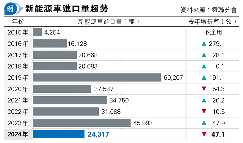 此外,「去庫存」仍是去年的主要任務,雖然去年12月進口車銷售略回暖,但庫存深度仍維持在7.6個月高位。其中,去年新能源汽車進口量按年降47.1%至2.43萬輛(見圖)。