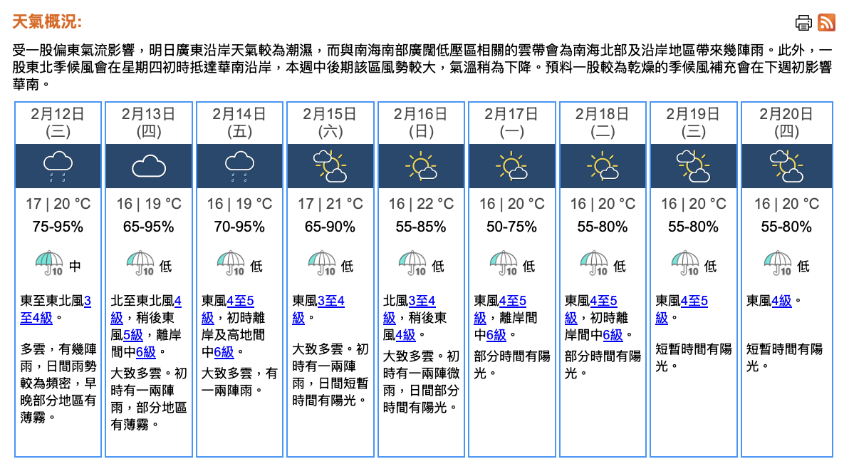 即時熱點 天氣|天文台:周三多雲雨勢頻密 氣溫介乎17至20°C (21:49) 發佈於 8 個月 前 2025 年 2 月 11 日 By 明報 天文台表示,受一股偏東氣流影響,明日(12日)廣東沿岸天氣較為潮濕,而與南海南部廣闊低壓區相關的雲帶會為南海北部及沿岸地區帶來幾陣雨,預測本港地區今晚(11日)及明日多雲,有幾陣雨。明日日間雨勢較為頻密,早晚部分地區有薄霧。氣溫介乎17至20°C。吹和緩東至東北風。展望隨後一兩日早晚清涼,風勢較大。周末期間短暫時間有陽光。(天文台) 相關文章:天文台天氣天氣速遞編輯推介 Up Next 情人節送花 紅玫瑰代表熱戀 12朵花「心心相印」 (13:38) 不要錯過 短片:巴西4900隻瀕危龜寶寶放歸大自然 (14:36) 繼續閱讀 贊助商 猜你喜歡 天氣|天文台:周五有驟雨 氣溫28至32°C (19:45) 天氣|天文台:周四局部地區有驟雨 日間炎熱最高32°C (21:00) 天氣|天文台:今早多處地區錄5毫米雨量 今日多雲有驟雨 下午部分地區雨勢較大有雷暴 (09:20) 天氣|酷熱警告生效 天文台:周末有一兩陣驟雨 (08:22) 天氣|天文台:周四天晴局部地區有驟雨 最高32°C (20:56) 今年10月已有4日達33℃以上 破1884年以來紀錄 (17:45)