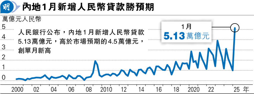 去年底內地放寬貨幣政策,並促進各地重大項目建設盡早啟動,帶動1月新增人民幣貸款額達5.13萬億元,較市場預期4.53萬億元為高。企業單位貸款增加4.78萬億元創新高,其中短期和中長期貸款,分別增加1.74萬億元和3.46萬億元。住戶貸款增4438億元,與按揭貸款相關的中長期貸款增4935億元,惟短期貸款減少497億元。