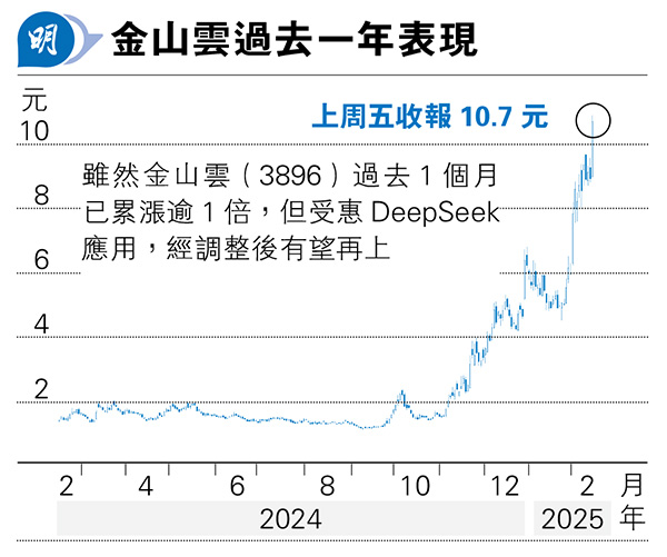 換言之,DeepSeek未必能令所有中資股起死回生,但可為A股和港股升勢「錦上添花」,趁各路資金重新流入,不妨增持中資股特別是科技股比重。個股方面,除了行業龍頭阿里巴巴(9988)及騰訊(0700)外,雲概念股例如金山雲(3896)值得關注,雖然過去1個月已累漲1.1倍,但受惠DeepSeek應用,回吐後有望再上。若不想揀股,可留意各類AI概念ETF,例如未來資產環球投資近日新推的Global X AI基礎設施ETF(3401),此ETF聚焦於AI基建發展的公司,不妨一試。