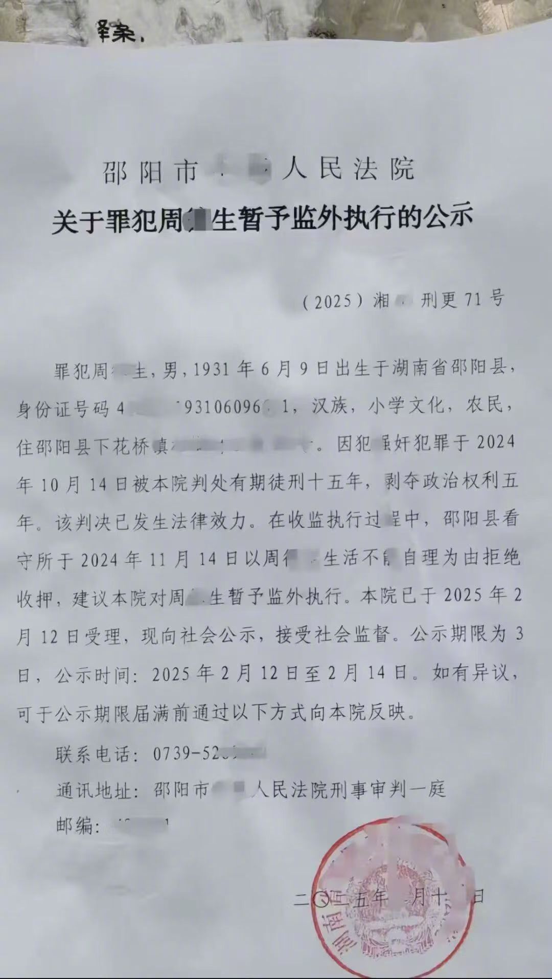 湖南省邵陽市中級法院近日一則公告引起廣泛關注,該公告顯示,93歲男子周X生因犯強姦罪,2024年10月14日被該院判處有期徒刑15年,判決已生效。