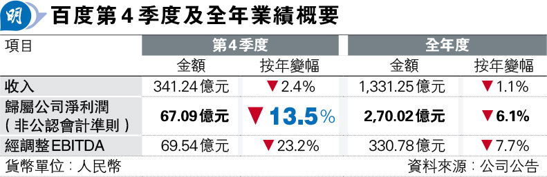 【明報專訊】百度(9888)公布去年第四季度及全年度業績,按非公認會計準則,季內股東應佔淨利潤67.09億元(人民幣,下同),按年減少13%;按季則增長13.98%。全年計股東應佔淨利潤則按年跌6%,達270.02億元。百度核心經營利潤按季計達46.47億元,按年減少25%,但是較市場預期的46億元稍多。至於除息稅、折舊及攤銷前盈利(EBITDA)則為69.54億元,按年減少23%,比市場預期的74.7億元為少。全年計EBITDA達330.78億元,按年減少8%。