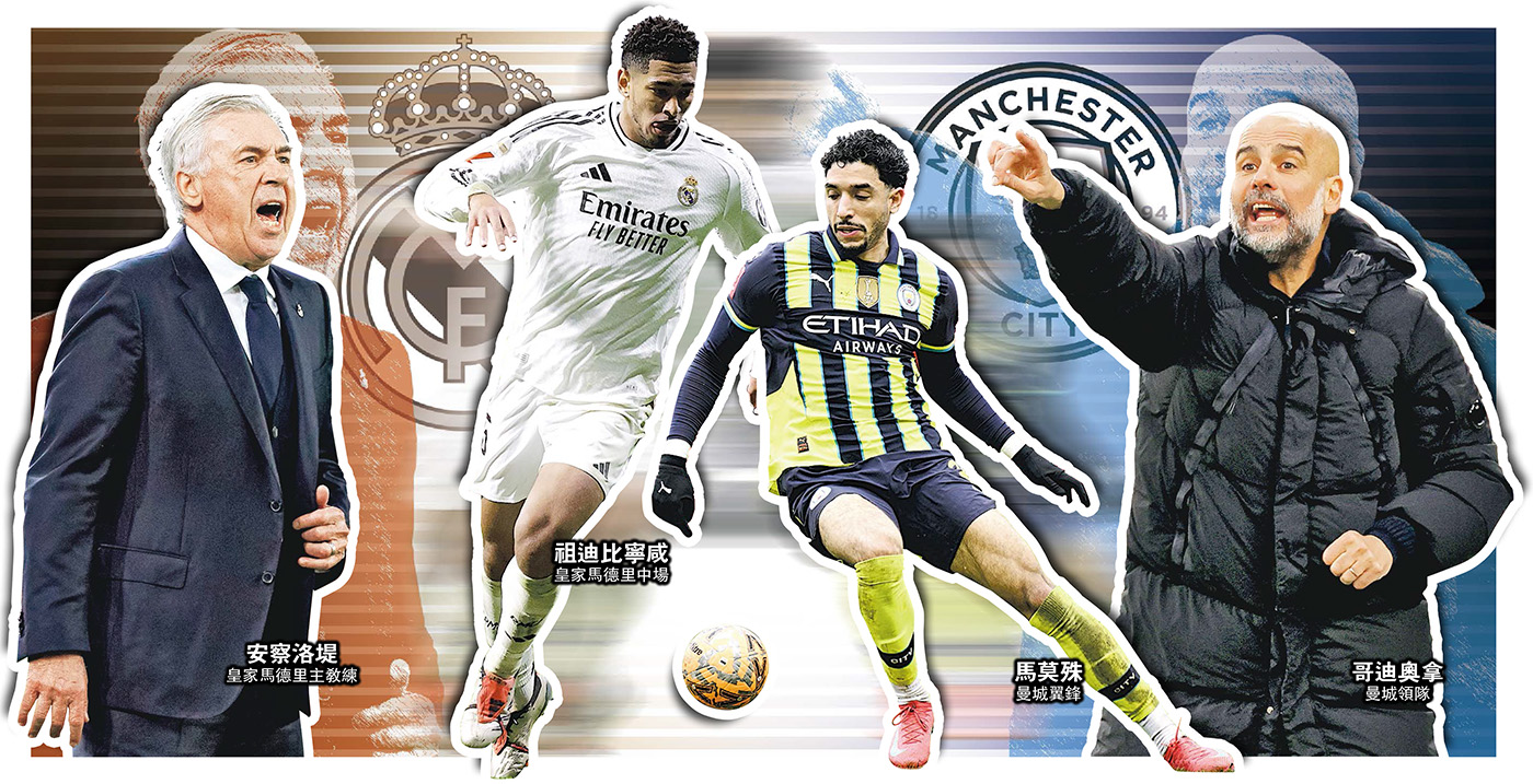 【明報專訊】曼城上周中在歐聯淘汰圈附加賽首回合主場以2:3反負皇家馬德里後,主帥哥迪奧拿曾悲觀預測明晨次回合反勝晉級16強的機會只有1%,惟這微小得像奇蹟的成功率,或將取決於冬窗新兵前鋒馬莫殊、無緣首回合的中場尼高干沙利斯及中堅卡胡辛洛夫的衝擊。「銀河艦隊」則有魯迪格及阿拉巴近日復操,勢可改善今季千瘡百孔的後防。