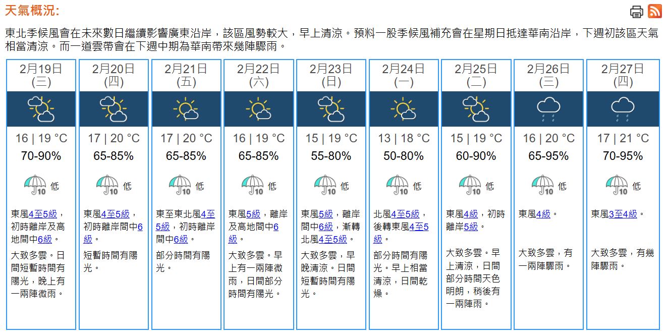 即時熱點 天氣|天文台:多雲最高約19°C 下周初相當清涼 (08:45) 發佈於 10 個月 前 2025 年 2 月 19 日 By 明報 早上8時30分,天文台錄得氣溫16.1°C,相對濕度76%。 東北季候風正影響廣東沿岸。同時,一道雲帶覆蓋該區。本港地區今日(19日)大致多雲。日間短暫時間有陽光,最高氣溫約19°C。今晚有一兩陣微雨。吹和緩至清勁東風,初時離岸及高地間中吹強風。 展望未來數日風勢較大,早上清涼,日間部分時間有陽光。下周初天氣相當清涼。(天文台) 相關文章:天文台天氣天氣速遞 Up Next 天氣|天文台:周四短暫時間有陽光 氣溫介乎16至20°C (21:30) 不要錯過 摘士多啤梨好去處:5果園資訊一覽 (09:49) 繼續閱讀 贊助商 猜你喜歡 天氣|天文台:日間部分時間有陽光 最高23°C (08:46) 天氣|天文台:日間乾燥 晚上漸轉多雲 (08:20) 天氣|天文台:日間乾燥溫暖 最高25°C (08:14) 天氣|天文台:周四天晴乾燥 最高23°C (20:50) 天氣|天文台:周三大致天晴乾燥 市區最低19°C (21:08) 天氣|天文台:大致天晴 最高23°C (08:14)