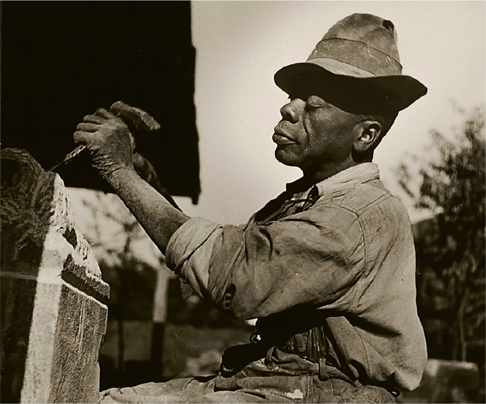 他的石雕風格樸實直白,價格低廉,幾年之後,很多鄰居家裏和花園都擺着他的雕塑,他在本地開始小有名氣。後來被當地一個藝術愛好者發掘,他的作品逐漸進入本地藝術圈層。真正讓他廣為所知的,來自攝影師Louise Dahl-Wolfe給他拍攝的一組照片,她當時在紐約為Harper’s Bazaar工作,拍攝了Edmondson在後院工作的場景。照片裏,Edmondson頭戴小圓帽,穿著寬大的襯衫,袖口挽起,灰撲撲的工作服上滿是石灰。他一手握着錘子,一手拿着鑿子,神情專注,卻又帶着幾分漫不經心的隨意。這組考究又極具感染力的照片,為Edmondson成名起到了至關重要的作用。1937年,紐約現代藝術博物館(MoMA)舉辦了Edmondson的個展,展出12件石雕,使他成為在該館首個舉辦個展的非裔美國藝術家。