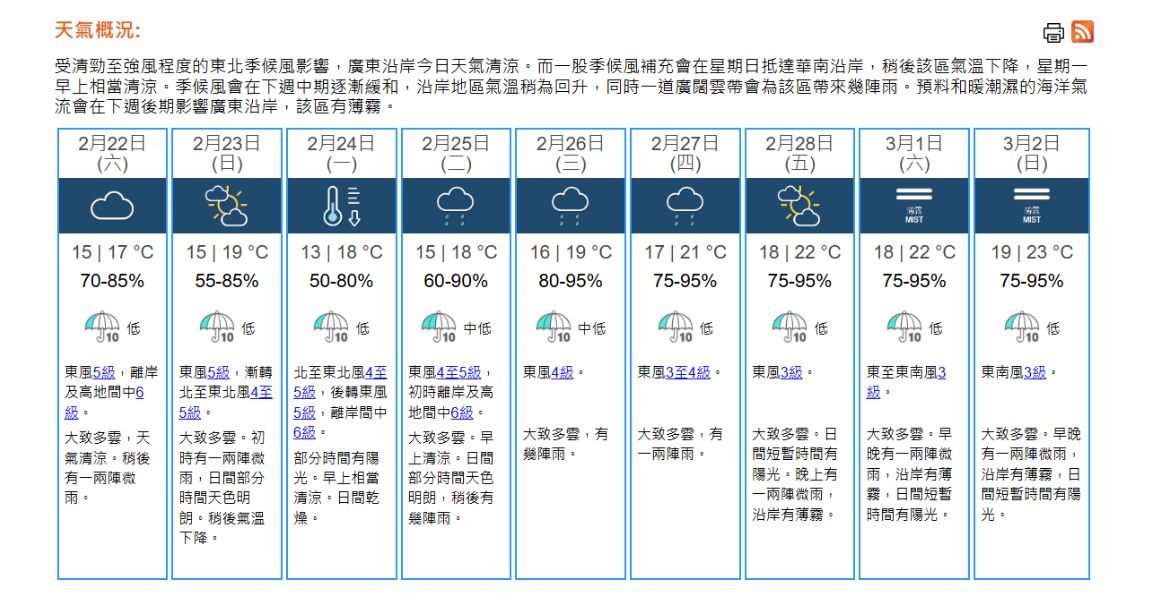 即時熱點 天氣|天文台:多雲有微雨 最高17°C (10:15) 發佈於 1 年 前 2025 年 2 月 22 日 By 明報 上午9時50分,天文台錄得16.4°C,相對濕度77%。本港地區今日天氣預測大致多雲,天氣清涼,最高氣溫約17°C。稍後有一兩陣微雨,吹清勁偏東風,離岸及高地間中吹強風。 展望明日(23日)漸轉吹偏北風,稍後氣溫下降,周一(24日)早上市區最低氣溫約13°C左右。下周中期雲量增多,有幾陣雨,氣溫稍為回升。(天文台) 相關文章:天文台天氣天氣速遞編輯推介 Up Next 深水埗設計新地標 體驗毛線戳繡 (09:30) 不要錯過 櫻花|短片:機場櫻花園 粉紅花海吸睛 (12:08) 繼續閱讀 贊助商 猜你喜歡 天氣|天文台:周日早上市區最低14℃ 部分地區寒冷 (17:55) 天氣|天文台:多雲有幾陣雨 今晚轉涼降至約17℃ (09:25) 【Emily】天文台「矚目天氣及氣候事件選舉」 投票有機會獲紀念品 天氣|天文台:周六多雲有雨 晚上轉涼氣溫17至21°C 下周日跌至最低14°C (21:22) 天氣|天文台:短暫時間有陽光 最高19°C (08:24) 天氣|天文台:周四多雲早晚有微雨 氣溫介乎17至20°C (20:57)