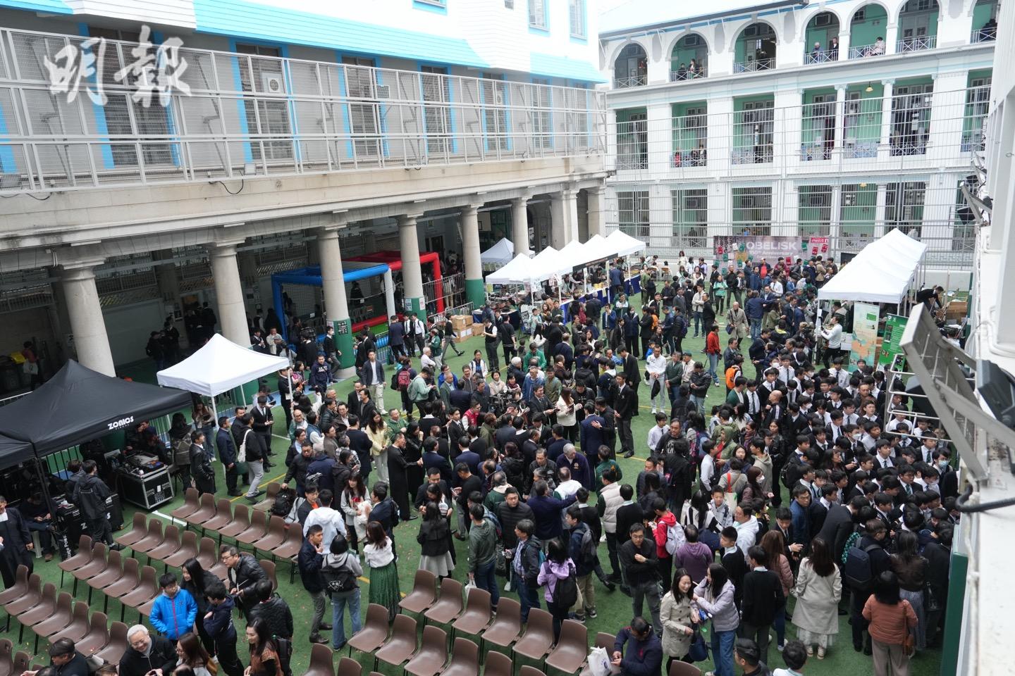 為慶祝創校150周年,校方今天安排了多個攤位及表演,如學會展覽、無人機足球體驗、學生及歌手校友許廷鏗表演等。