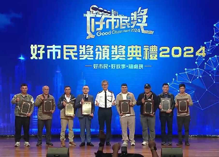 好市民獎頒獎典禮2024今日(23日)舉行,今年有80名市民及7間機構獲獎。9名於佐敦華豐大廈三級火時自發參與救援的市民同獲「全年好市民獎」,其中一名得獎者周沚諭說,希望能以生命影響生命,建立一個好的榜樣承傳下去,相信「人人都可以做一個好市民」。
