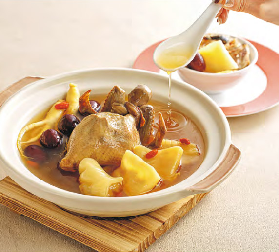 除鮮人參及花旗參,餐廳亦用上矜貴食材,如鮑魚、星斑、花膠、頂鴿等,兼顧養生與美味。多道菜式中最吸引的,非杞子人參花膠鴿吞素翅莫屬,此菜式靈感源自懷舊手工菜「仙鶴神針」,選用體型較大的頂鴿,去除胸骨後,將煨煮入味的關西遼參絲、金華火腿及素翅釀入鴿內,再把全鴿與花膠人參湯同燉,濃香鮮甜。