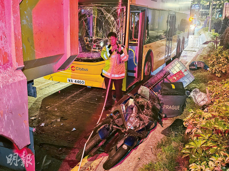 現場所見,涉事路段行車線疑有油漬,被撞電單車嚴重損毁,路面遺留大灘血迹,碎片及雜物散落一地,涉事城巴車頭凹陷,擋風玻璃爆裂。警方臨時封鎖部分行車線蒐證,意外起因仍待調查。