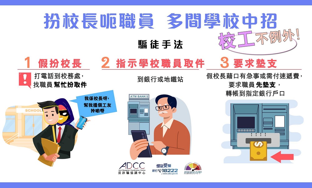 警方又提到,騙徒通過校務處通知校工,令事主相信來電者是校長或學校職員,而過程中,多名校工未有向校方確認指示便轉帳。