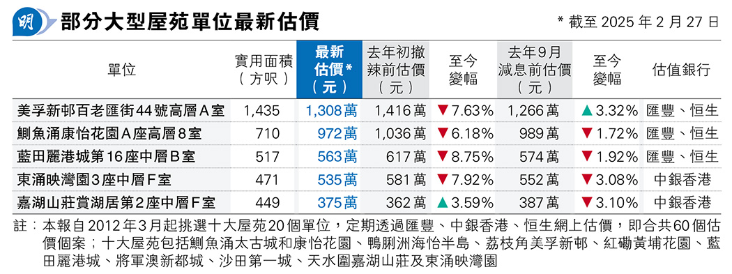值得一提的是,大部分單位的估價,在「撤辣」後均曾出現升幅,惟其後受新盤以低價推出搶客、二手減價成交增加等因素影響,估值再度下挫。至去年8月,大部分單位的估值,皆跌穿「撤辣」前水平,但9月美國啟動減息,樓價跌勢略見放緩,並有四成單位的估值,於12月減息後再錄得升幅,及至近月走勢則相對平穩。