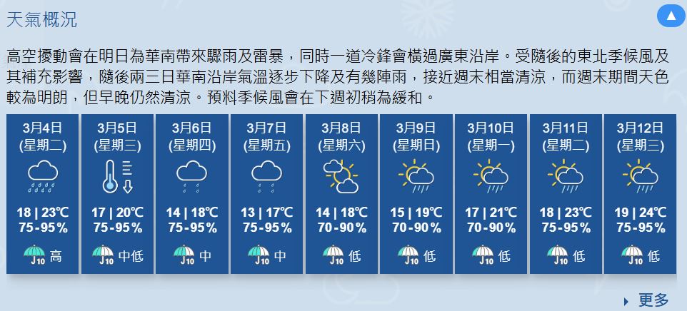 即時熱點 天文台:天氣今晚轉不穩定 明日將有較明顯降雨 局部地區有雷暴 (12:26) 發佈於 11 個月 前 2025 年 3 月 3 日 By 明報 天文台發出特別天氣提示,稱位於華中的冷鋒正逐漸向南移動,與高空擾動相關的驟雨及強雷暴正影響廣東內陸。預料今晚(3日)接近午夜珠江口一帶天氣會轉為不穩定,明日(4日)本港將出現今年首場較明顯的降雨,局部地區有雷暴。市民明早上班上學前請留意最新天氣報告。(天文台) 相關文章:天文台天氣天氣速遞熱門HOTPICK編輯推介 Up Next 寒潮南下廣東料氣溫急降或有冰雹 湖南岳陽落雹【短片】 (12:12) 不要錯過 短片:岩手縣山火擴大至2100公頃 自1989年以來火場面積最大 (16:00) 繼續閱讀 贊助商 猜你喜歡 天氣|天文台:短暫時間有陽光 最高19°C (08:24) 櫻花|短片:沙田安景街櫻花盛放【多圖】 (14:42) 天氣|天文台:周四多雲早晚有微雨 氣溫介乎17至20°C (20:57) 天氣|天文台:今早多區氣溫較昨日低1至2°C 日間最高21°C (08:24) 的士4月1日起須提供電子支付 違者最高罰5000元、監禁半年 (16:29) 天氣|天文台:周三有一兩陣微雨 早上清涼市區最低17°C (21:01)