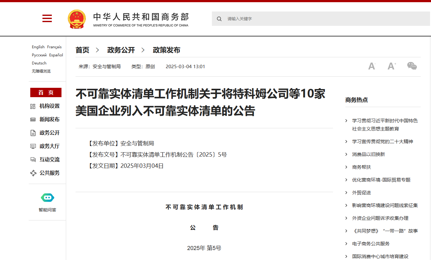 中國商務部3月4日發布,為維護國家主權、安全和發展利益,不可靠實體清單工作機制決定將特科姆公司(TCOM,Limited Partnership)、搖杆舵公司(Stick Rudder Enterprises LLC)、特勵達·布朗工程公司(Teledyne Brown Engineering,Inc.)、亨廷頓·英格爾斯工業公司(Huntington Ingalls Industries Inc.)、S3航空防務公司(S3 AeroDefense)、立方公司(Cubic Corporation)、文本礦公司(TextOre)、ACT1聯邦公司(ACT1 Federal)、埃克索維拉公司(Exovera)、扁平地球管理公司(Planate Management Group)等10家美國企業列入不可靠實體清單,禁止上述企業從事與中國有關的進出口活動,禁止上述企業在中國境內新增投資。