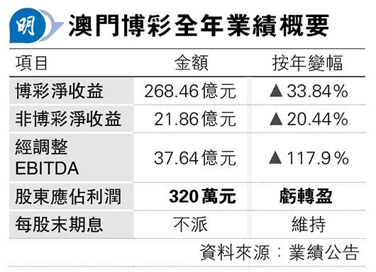 【明報專訊】澳門博彩(0800)公布2024年底止全年度受惠於上葡京扭虧,扭轉過去4年半虧損狀態,股東應佔溢利320萬元(見表),雖然這低於彭博共識預期,經調整EBITDA(除息稅、折舊及攤銷前盈利)卻達37.64億元,按年增1.17倍,符合市場預期;和去年度一樣不派末期息。