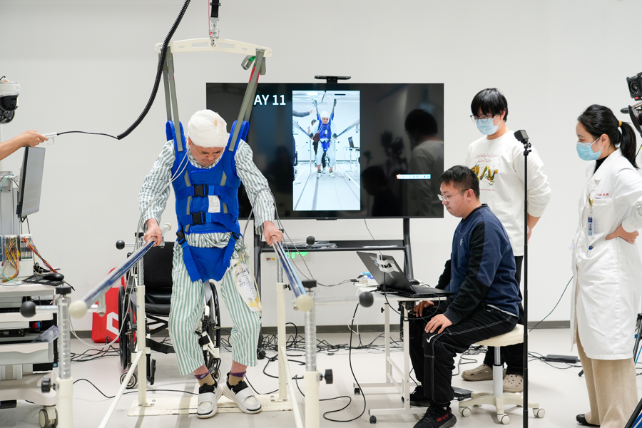 1月8日,研究團隊用時2小時,通過一次性微創手術方式完成了在腦內和脊髓硬膜外的關鍵調控部位置入電極。術後第1天,林先生的右腿就出現了緩慢的屈曲;第49天,他可以在懸吊下獨立使用助步器行走。林先生說,終於再次體會到走路的感覺。