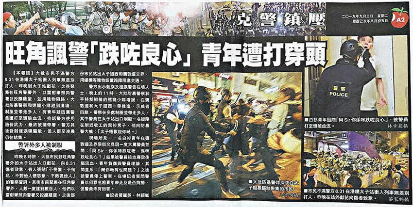 另外,辯方問到2019年9月和2020年4月黎分別撰寫的〈這是良知之戰〉及〈專橫暴政打壓 我們氣魄不滅〉。就前者,控方早前質疑黎虛構青年問警方「係咪跌咗良心?」後遭打至頭破血流。辯方昨展示《蘋果》當年9月3日報道〈旺角諷警「跌咗良心」 青年遭打穿頭〉;黎確認曾閱報道,否認虛構青年被毆一事。