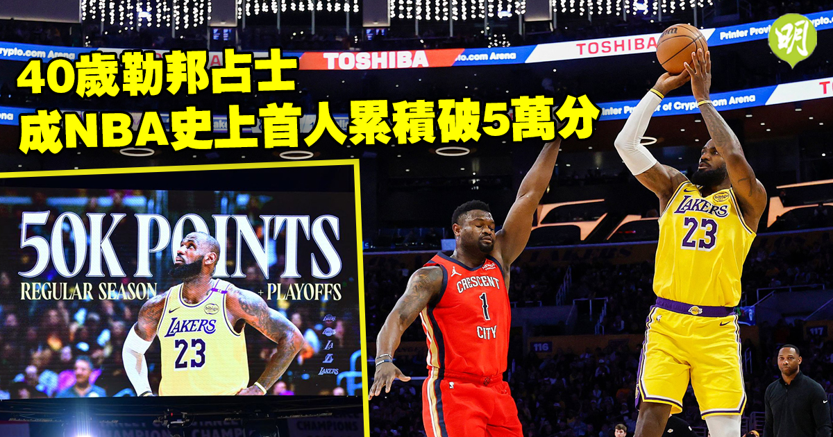 已踏入第22個球季的勒邦占士,即使已年屆40歲仍保持籃壇頂尖水平,今季場均貢獻24.7分、8個籃板及8.6次助攻。他今隨湖人在NBA常規賽迎戰塘鵝,上陣33分鐘取34分、8個籃板及6次助攻,加上另一球星盧卡當錫亦貢獻「雙雙」的30分及15次助攻,領銜在主場以136:115大勝取七連捷,賽後以39勝21負升上西岸次席。而占士職業生涯連同常規賽及季後賽累計攻入5,0033分,更成為NBA史上首名總得分突破5萬的球員。賽後他表示:「我依舊喜愛着在場上打球,交出自己所能貢獻球隊,希望我可繼續享受作為職業球員的過程。」