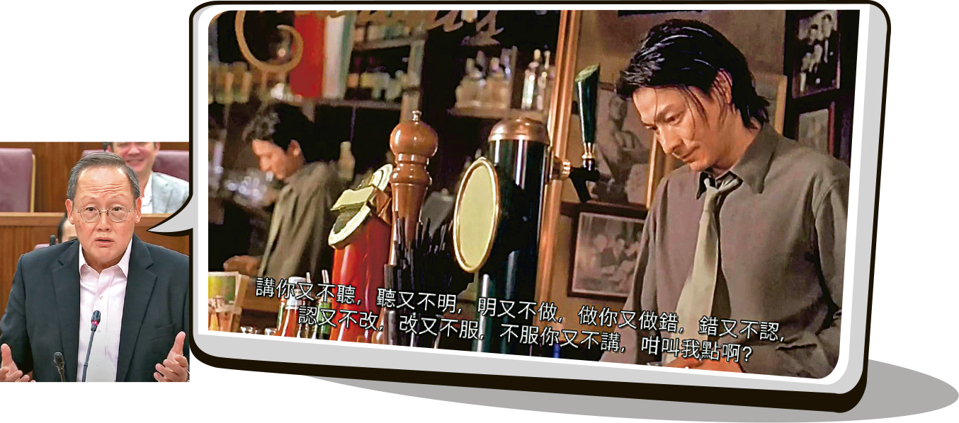 【明報專訊】新加坡國會辯論普遍用英語發言,不過當地政府一個部長噚日就「轉channel」用廣東話,更引用港產片《江湖》入面劉德華嘅對白嚟反擊在野黨議員。