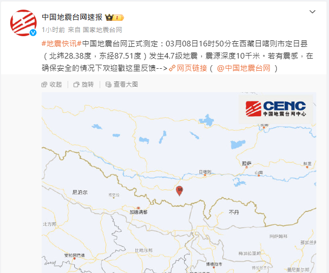 即時兩岸 西藏定日4.7級地震 未有損毀報告 (18:12) 發佈於 8 個月 前 2025 年 3 月 8 日 By 明報 中國地震台網正式測定:3月8日下午4時50分,在西藏日喀則市定日縣(北緯28.38度,東經87.51度)發生4.7級地震,震源深度10公里。 隨後的下午5時19分,附近(北緯28.40度,東經87.50度)再發生3.0級地震,震源深度10公里。 震央周邊5公里內有村莊。暫時官方未有通報傷亡及損毀情況。(綜合報道) 相關文章:地震定日編輯推介西藏 Up Next 兩會 | 今天日程:民生主題記者會 政協第三次全體會議 台灣團開放採訪 (00:05) 不要錯過 兩會 | 新疆官員:民眾可以自由選擇工作 (17:32) 繼續閱讀 贊助商 猜你喜歡 【東京】鏡頭下的震災重生敘事 蔡國強巴黎龐比度再辦煙花騷 對話活動取消 (16:24) 西藏煙火秀後 始祖鳥大中華區總經理離職 (23:52) 雲南普洱市景谷縣發生3.6級地震 (16:25) 珠峰暴雪困近千人 央視:已有350人安全抵接應點 (09:13) 中國北方局部明起降溫10℃以上 青藏有暴雪 (19:35)